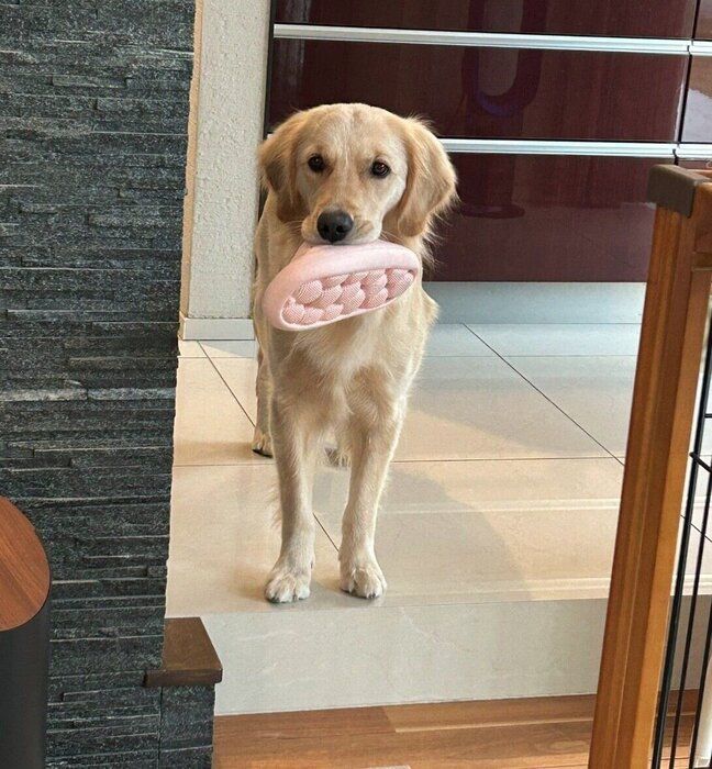 「この行動は朝の忙しい時間帯にはあまりしませんが、家族が家にいるときにはいつもします。あっという間にスリッパをくわえて持って行き噛むイタズラをするので、普段はすぐに追いかけて取り戻したり、そのまま引っ張り合いをして遊んだりしています。