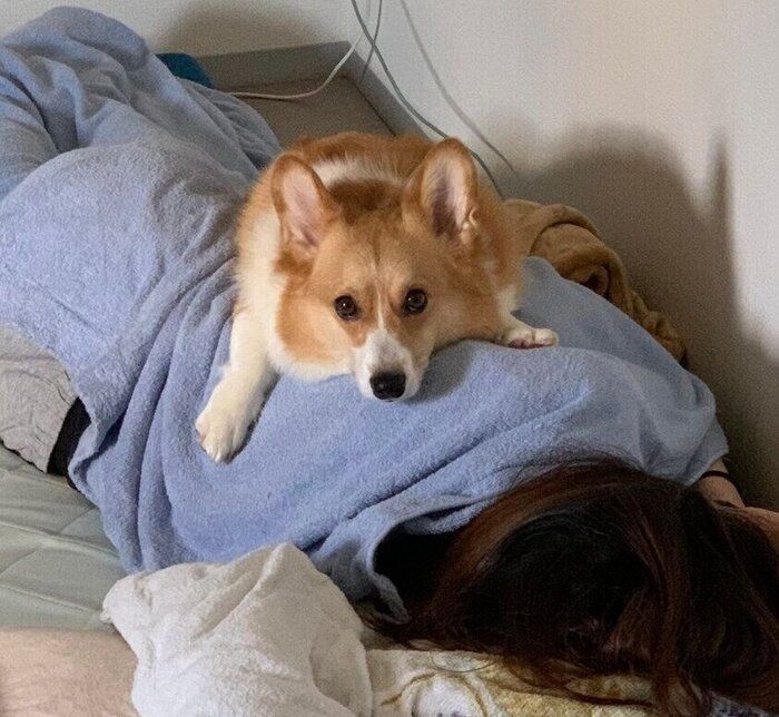 コーギーが“犬布団”と化す!?休日に遅くまで寝ている飼い主さんの上に乗る心理とは|獣医師解説