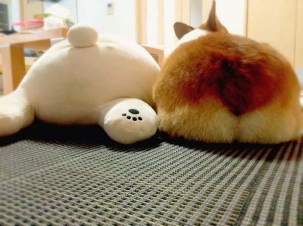 しろくまさんとお尻対決をしているコーギーちゃん。まん丸シルエットが可愛いですね♪