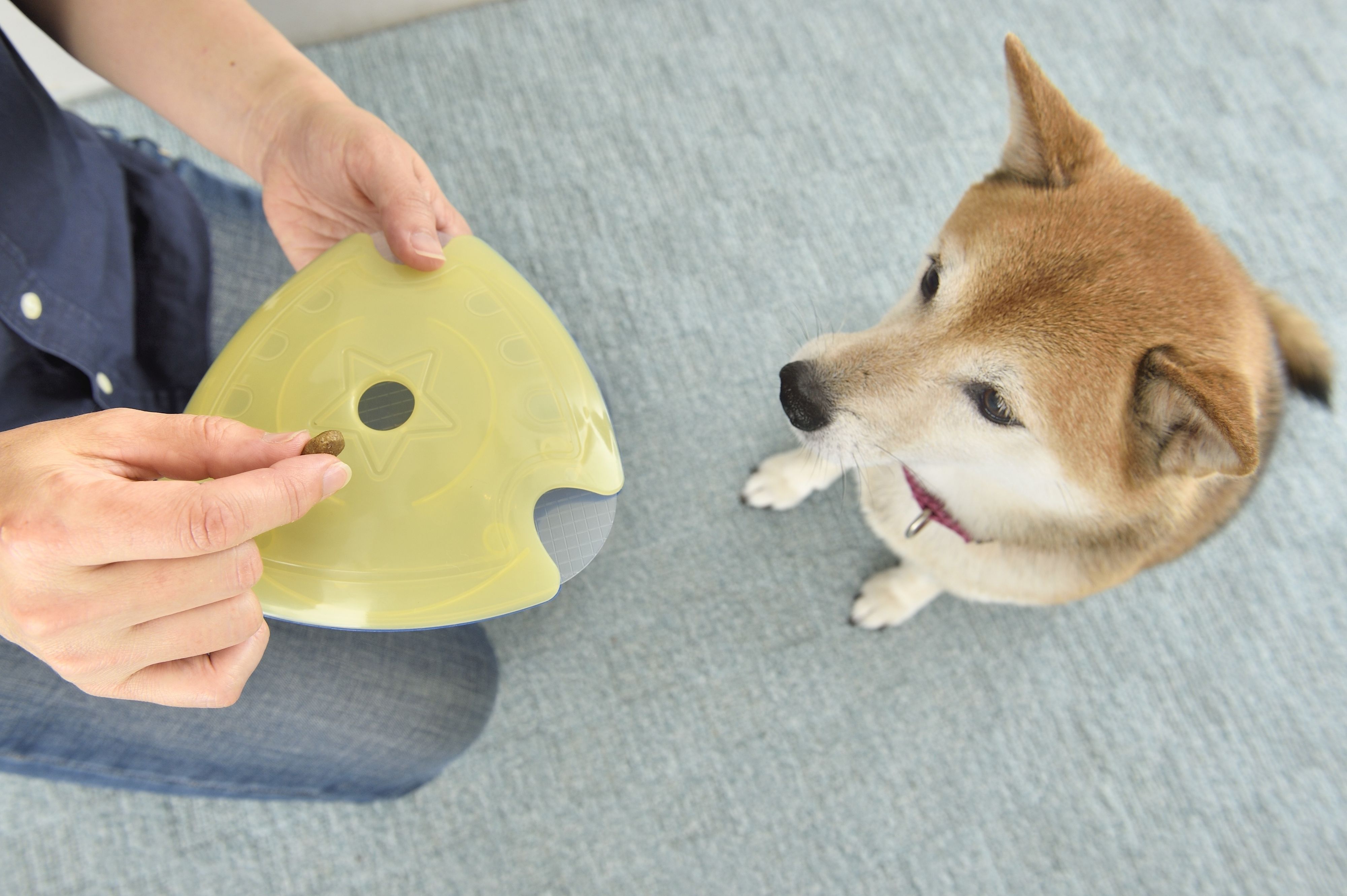 愛犬が飛びついて奪い取らないよう、オスワリやマッテをさせ、その間におもちゃの真ん中の穴からフードを入れます。