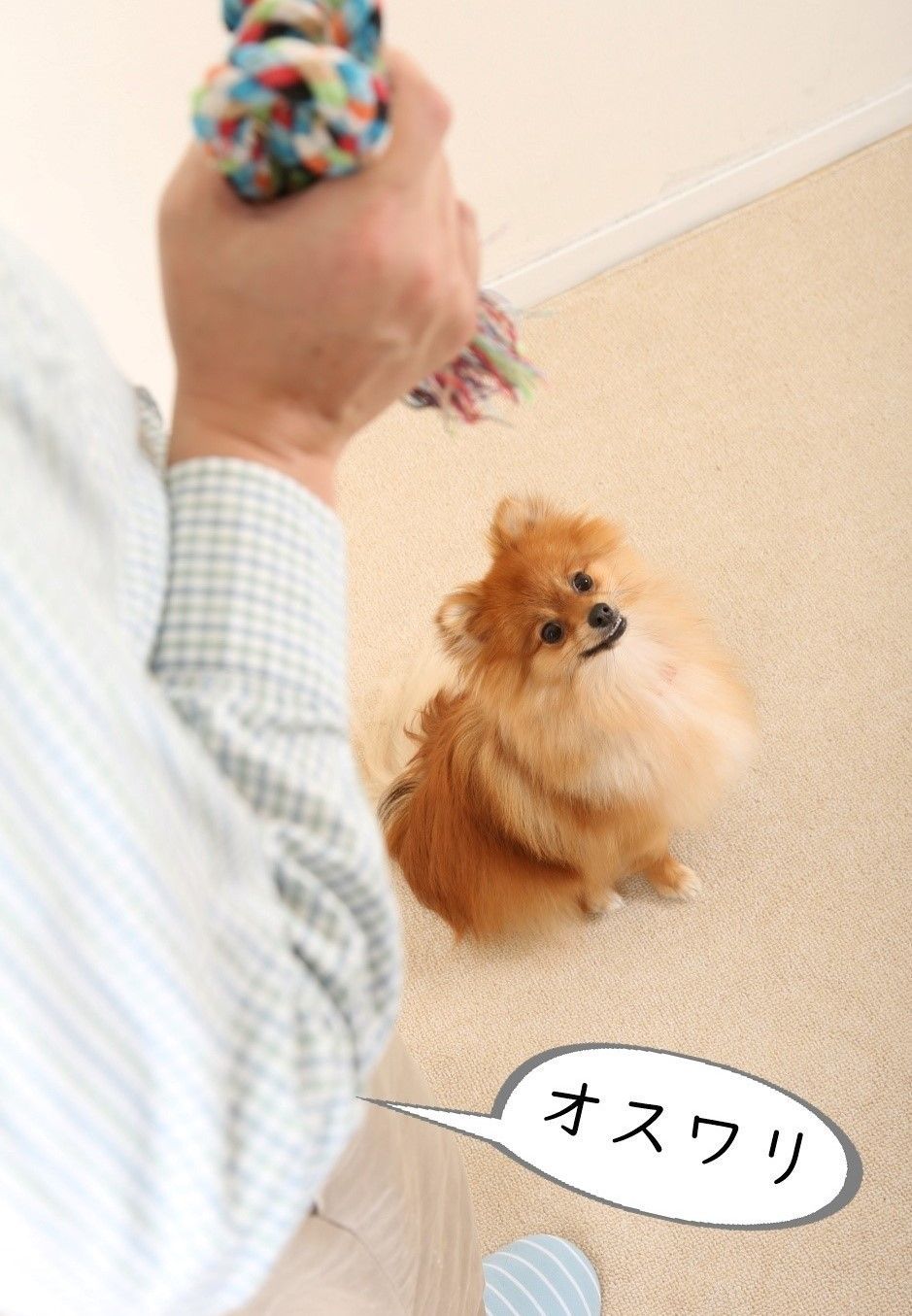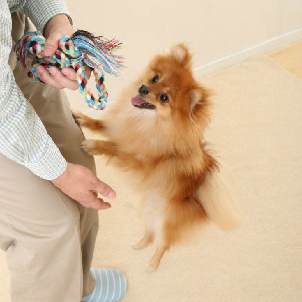 興奮をやめてきちんとオスワリできたごほうびとして、手にしたおもちゃでいっしょに遊んだり、おやつを与えたりして、再び興奮することを防いでもいいですね。