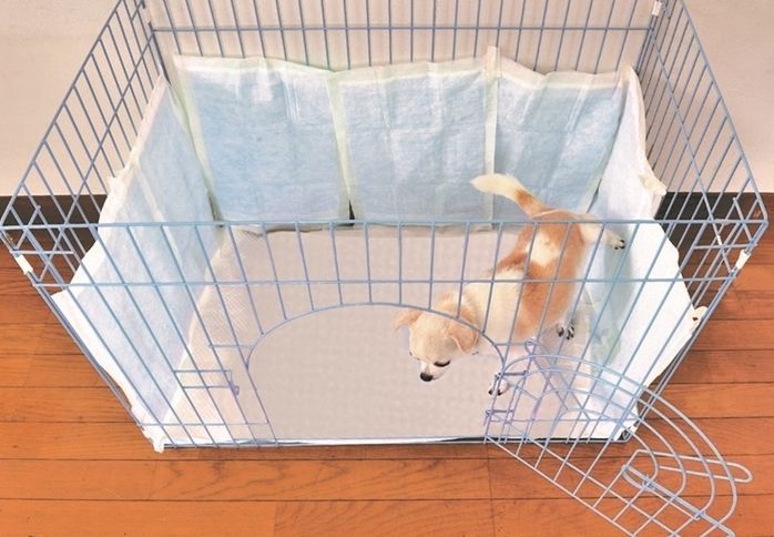 さらに写真のようにまわりの柵にトイレシーツを貼れば、足を上げてオシッコをする犬にも対応できますよ!