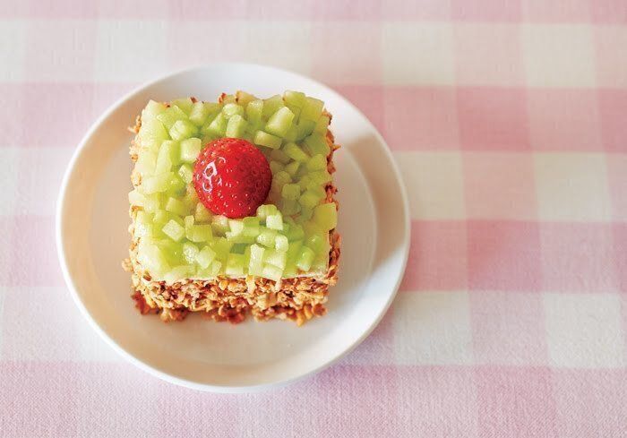 - 木綿豆腐の側面に1をまぶし、中央にいちごをのせ、いちごのまわりに2を散らす。