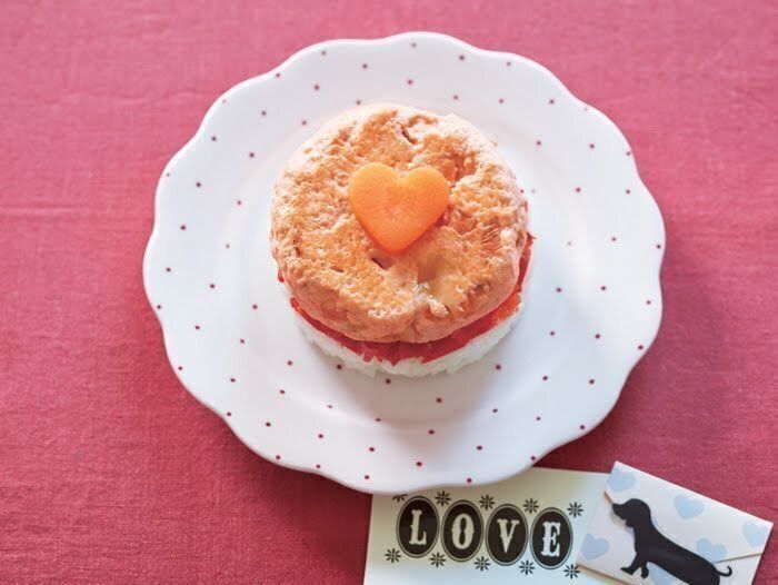 - セルクル(底のない丸型)にごはんを詰め、赤パプリカ、4のハンバーグ、ハート型のにんじんの順に重ねる。