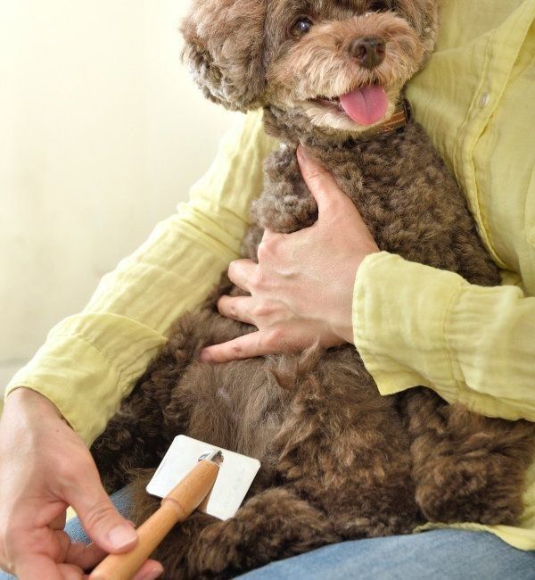 全体には、柔らかいブラシでやさしくブラッシングを。毛玉には、コームやスリッカーブラシを使用して、丁寧にほどきましょう。