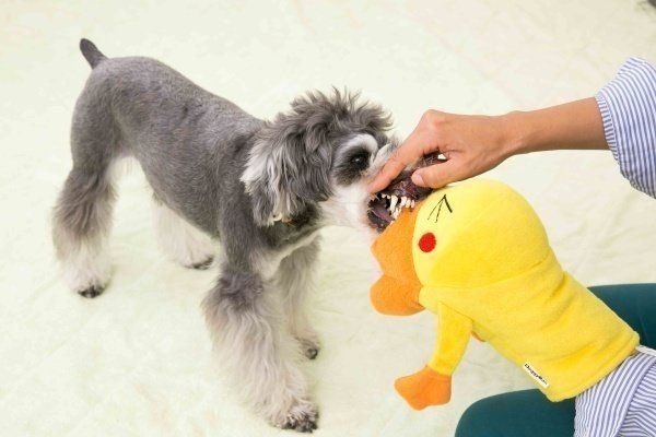愛犬がおもちゃをくわえたときに見えた歯の、表面の色や歯垢・歯石の有無を確認。