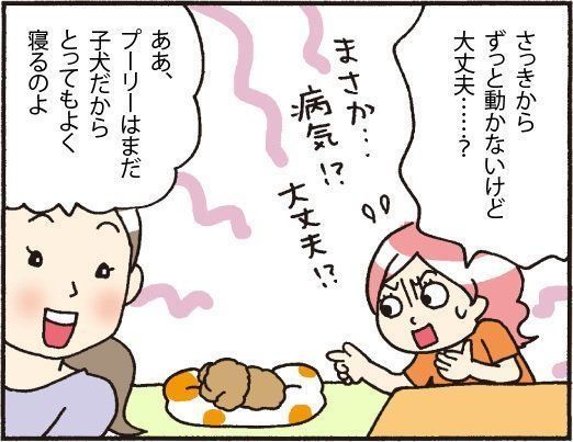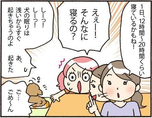 眠りが浅く熟睡できる時間が短いため、ちょっとした物音でもすぐに目を覚ましてしまうことも。犬が眠っているときはなるべく周囲を静かにしてあげましょう。とくに子犬は「遊びたい」という気持ちが強く、かまってもらえるとうれしくて起きてしまいがち。寝不足が続くと体調不良や情緒不安定の原因にもなってしまいます。お父さんが夜中に帰ってきて、眠っている犬にちょっかいを出すのももちろんNGです!