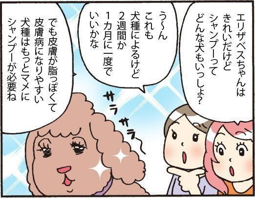 皮膚の状態は犬種によって違いますし、個体差もありますが、2週間〜1カ月に1回ぐらいで大丈夫です。においが気になるようならばもう少しまめにシャンプーをしてもOK。たとえば皮膚が脂っぽいシー・ズーなどは、脂漏性皮膚炎になりやすいため1週間に1回ぐらいの頻度でもよいでしょう。ただし、やりすぎは禁物! 過剰なシャンプーは犬に必要な脂分まで奪ってしまい、そこに細菌が感染すると膿皮症など皮膚の病気になるリスクもあります。