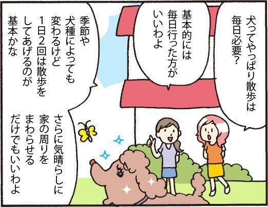 犬種にもよりますが、1日2回ぐらいに分けてトータル1時間ぐらいは外に出るようにしてあげましょう。体力の少ない小型犬の場合は、短時間に分けてちょこちょこ散歩に出るのが理想的。さらに家の周囲を少し回るだけでも、犬にとっては気晴らしになります。散歩をたくさん経験している犬ほど、見知らぬ犬や人に対してむやみに警戒心をもつことなく「社会性のある犬」に育ちます。
