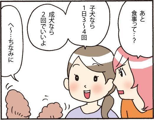 1日の食事量はドッグフードのパッケージに記載されている目安を基準に、犬の体調や体型によって調整を。子犬に必要な栄養分は成犬の約2倍。生後42日〜3カ月ぐらいまでは子犬専用のドッグフードをお湯でふやかして、やわらかくしてから与えます。それ以降はドライフードをそのまま与えて大丈夫。生後7か月ぐらいから、1日2食に変えていきましょう。