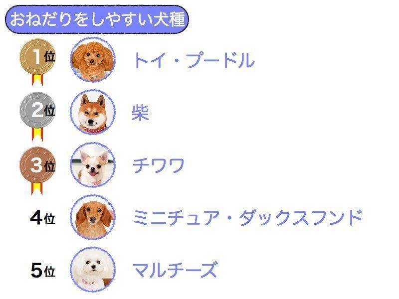 飼い主さんがつい甘やかしてしまう愛くるしい小型犬は、おねだりによって自分の要求が通ることを覚えがち。とくにトイ・プードルは頭がよく、あの手この手でおねだりすることも。一方、忠犬というイメージが強い柴は、飼い主さんが自分に忠実に育てようとするあまり、甘やかしがちになる傾向が見られます。