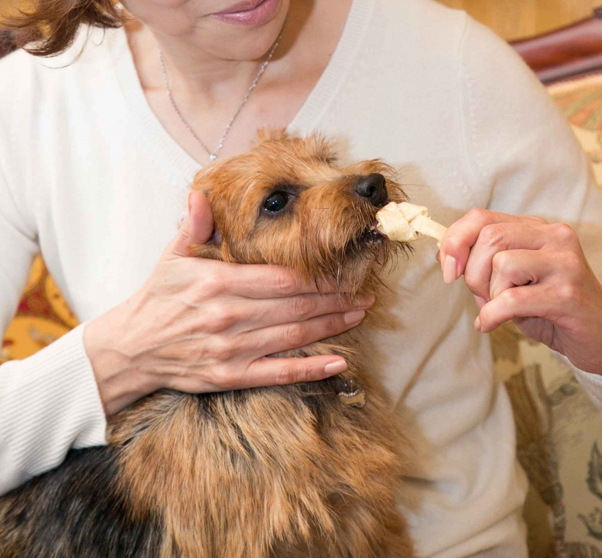 かじったりなめたりできるおやつを愛犬に与え、まずは比較的触られるのが平気な部位から触ります。愛犬がおやつに集中しているのを確認し、徐々に足先など苦手な部分を触る練習をしましょう。徐々に慣れてきて、触られるのが平気になっていきます。ただし、おやつを飼い主さんから奪い、取られまいと守ろうする犬にはやらないようにしてくださいね。