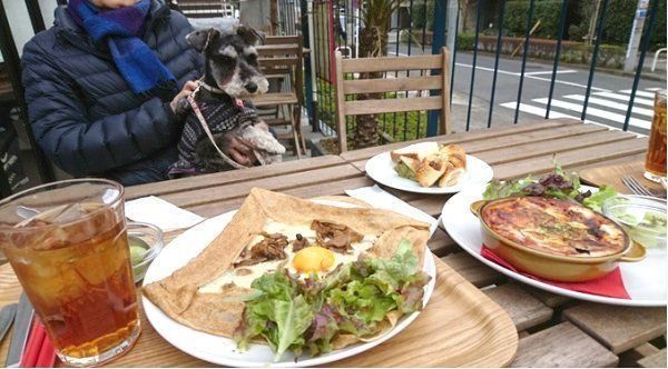 パンビュッフェが有名なこのお店は、テラス席はペットOK。おいしそうなガレットをピューターちゃんが眺めていますね。