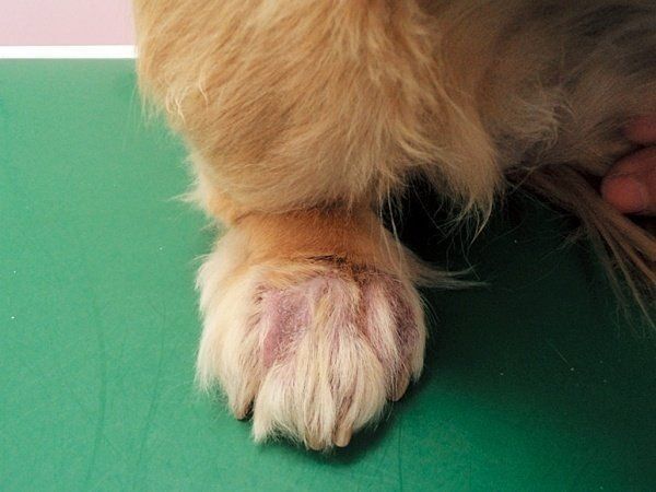 なめつづけて悪化する肉球の間の皮膚炎です。