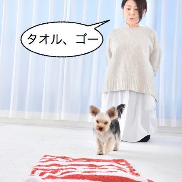 ①ができるようになったら、誘導するときに「タオル、ゴー!」と言葉を発します。