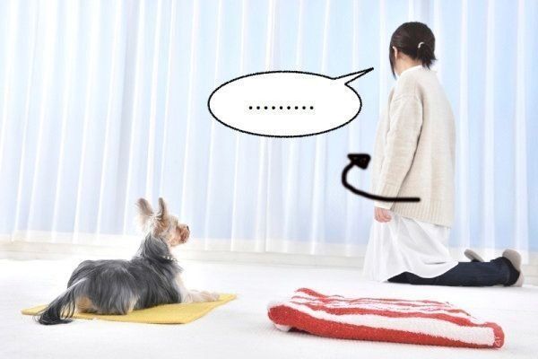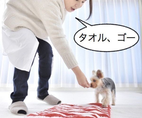 ②を繰り返したら、誘導なしで「タオル、ゴー!」と言うだけで、犬がタオルの上でフセをするか試してみましょう。