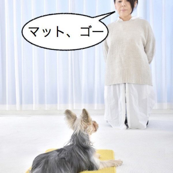 犬がタオルの上でフセができるようになったら、「マット、ゴー!」と言って、同様の方法でマットでもトレーニングしましょう。