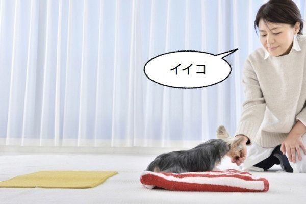 「タオル、ゴー!」と言って、犬がタオルの上でフセをしたら、ごほうびにフードを与えます。