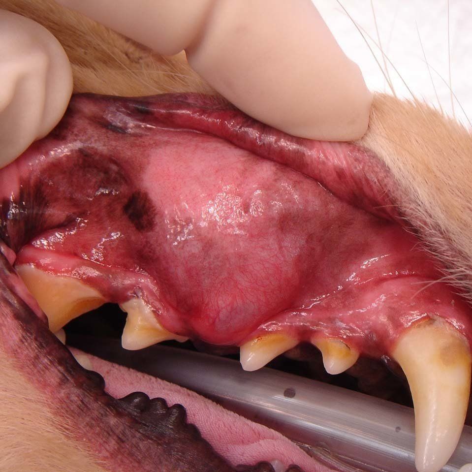 写真の中央、やや白くなり、盛り上がった歯肉が腫瘍部分です。