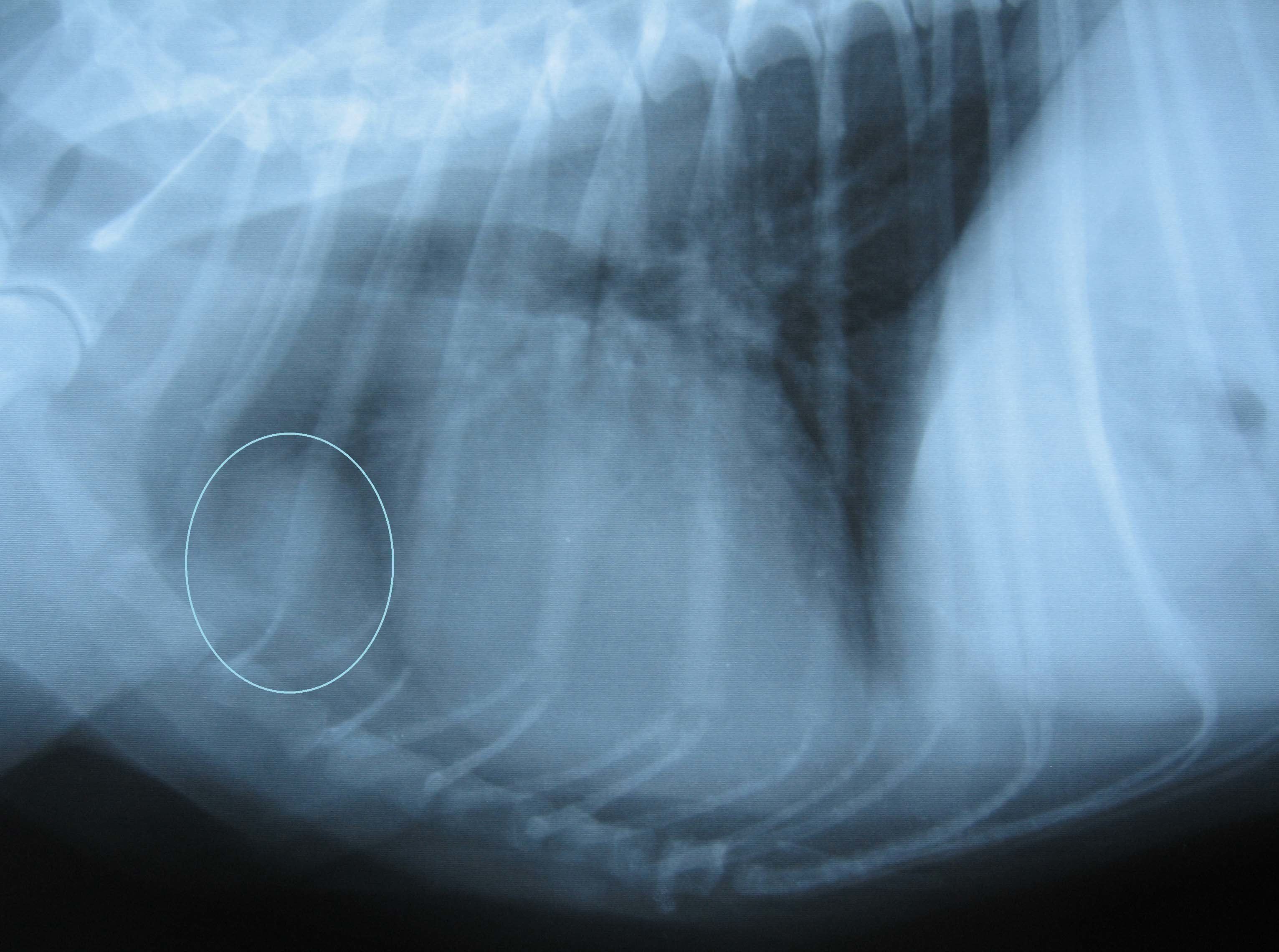 胸腔内腫瘍のレントゲン写真。白マルで囲まれた部分が腫瘍部分です。