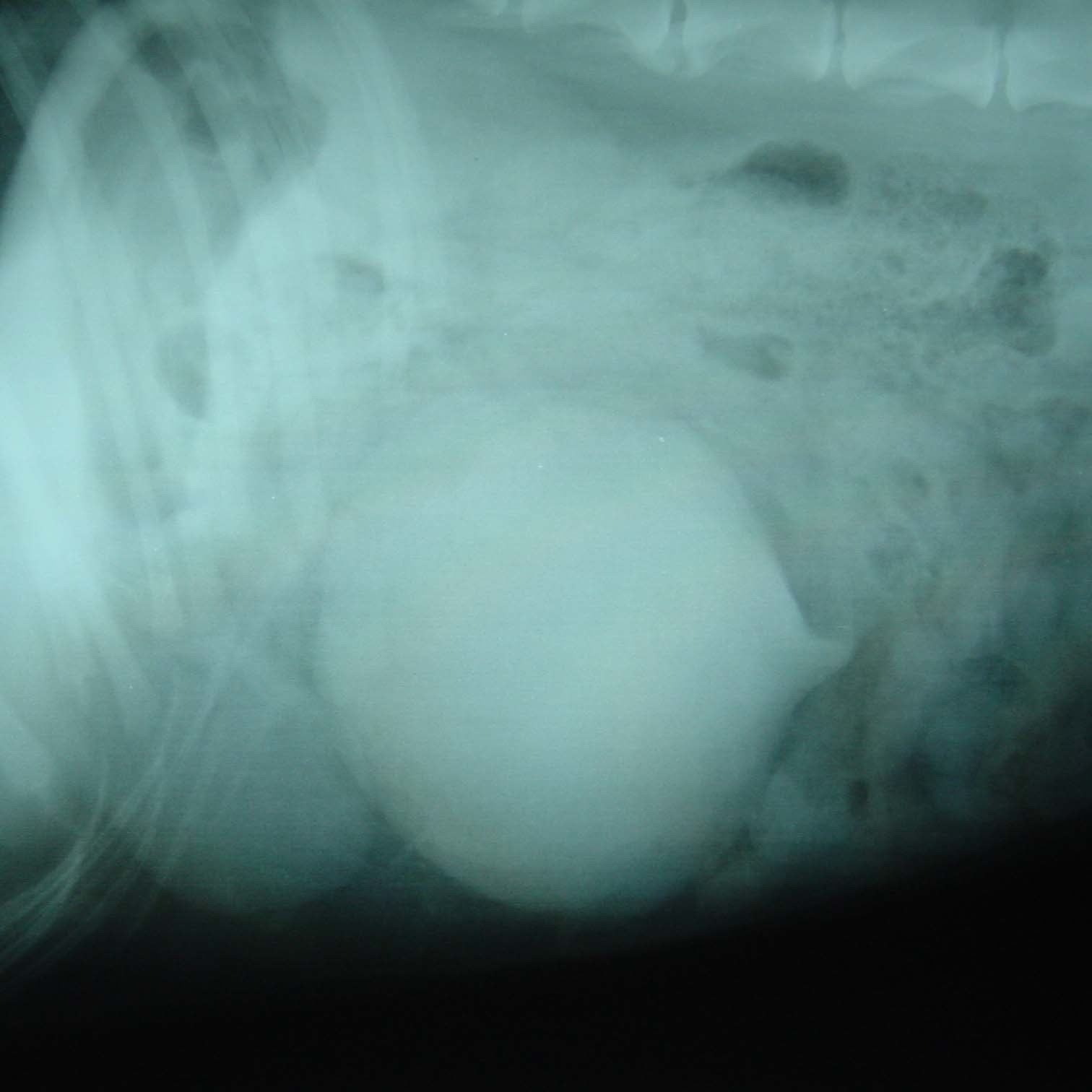 脾臓の腫瘍のレントゲン写真。中央の丸く白いところが腫瘍部分です。