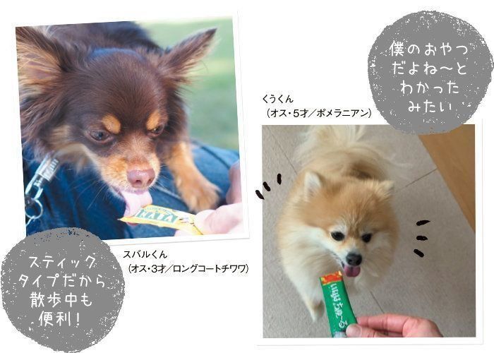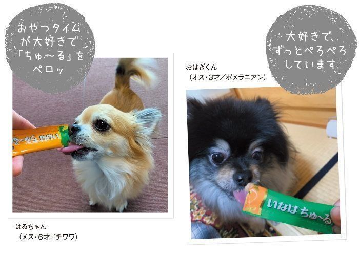 いつも、お散歩をしたあとのごほうびとして与えています。このおやつタイムが大好きで、私が「ちゅ~る」を手に持つと、どんなところからでも目を輝かせて駆けてきます。