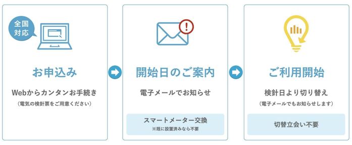 ①WEBで申込みをしたら、②後日届く利用開始日の案内メールを待って、③それまで通り電力を使うだけ。3ステップで簡単に切り替えが完了します。