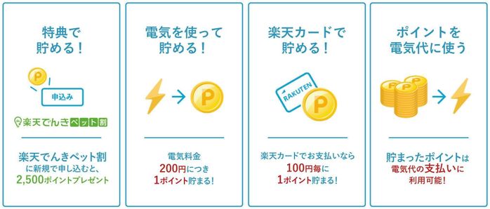 楽天でんきでは、電気料金200円につき楽天スーパーポイントが1ポイント貯まります。また、楽天カードで支払えば更に100円ごとに1ポイント貯まります。