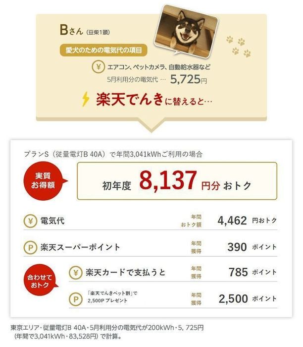 Bさん「スマホで簡単に申し込めて、1年間の電気代を抑えられるのはうれしいですね。もし電気代が浮いたら、その分を愛犬と旅行に行くための資金にしたいです。楽天が行っているサービスだから、安心して使えそうです」