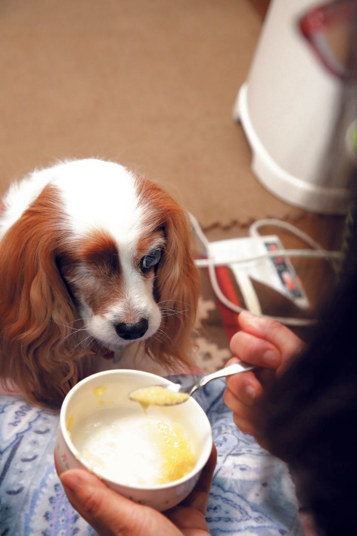 (写真は大好きなフルーツを食べるミルヒーくん。食べやすいようにすりおろされたリンゴをスプーンで上手に食べます)