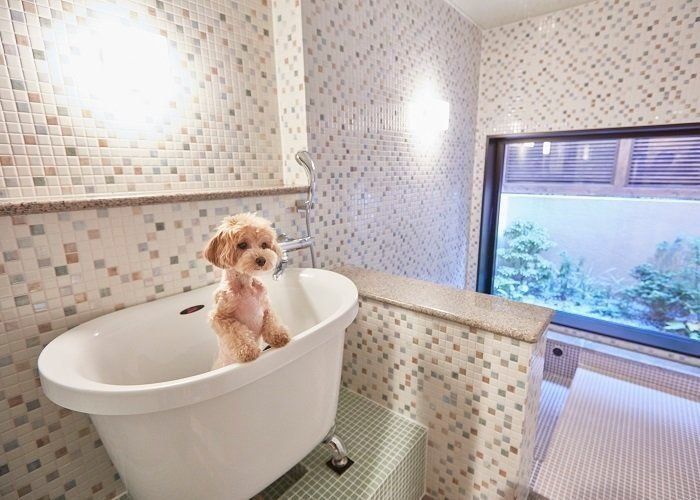 ペット用バス(有料・要予約)は、深さの異なるバスタブが用意され、小型犬から大型犬まで対応。ゆったりとしたブロースペースも完備しています。