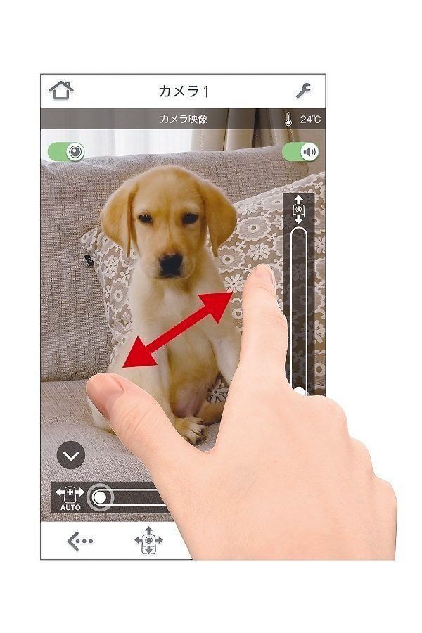 左右約360度、上下約90度の首振り機能がついた見守りカメラ。スマートフォンでカメラの首振り機能を操作できるので、愛犬を探しやすくて便利です。200万画素(フルHD)の高画質でチェックでき、録画機能(※)も搭載しているので、ふだん見ることのできない愛犬の意外な様子をじっくり楽しむこともできます。