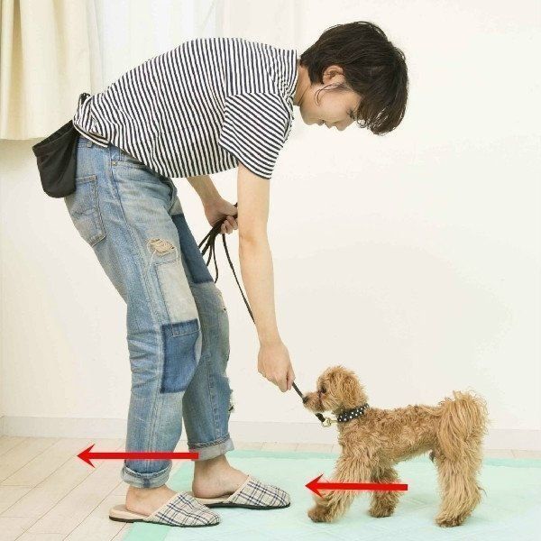 その手で愛犬を自分の足元に引きつけるようにしながら、1~2歩後ろへ下がります。