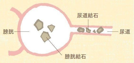 尿に含まれるマグネシウムやカルシウムなどのミネラル成分が固まって、結晶(結石のようなかたまりになる前の小さなもの)や結石ができる病気。腎臓や膀胱でつくられた結石は、尿管や尿道に落下し、これらのうち膀胱結石と尿道結石が下部尿路結石と呼ばれます。尿路の粘膜を傷つけたり、膀胱粘膜の肥厚が起こり、膀胱炎や尿道閉塞を招く原因にも。