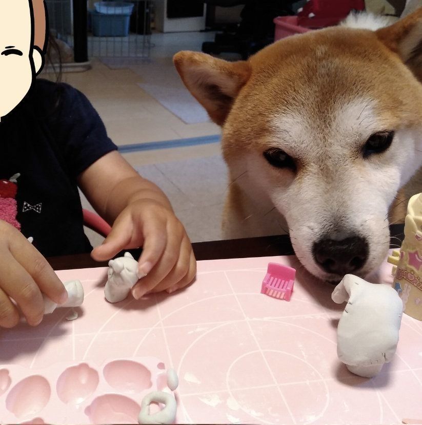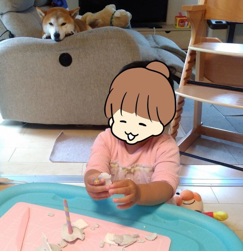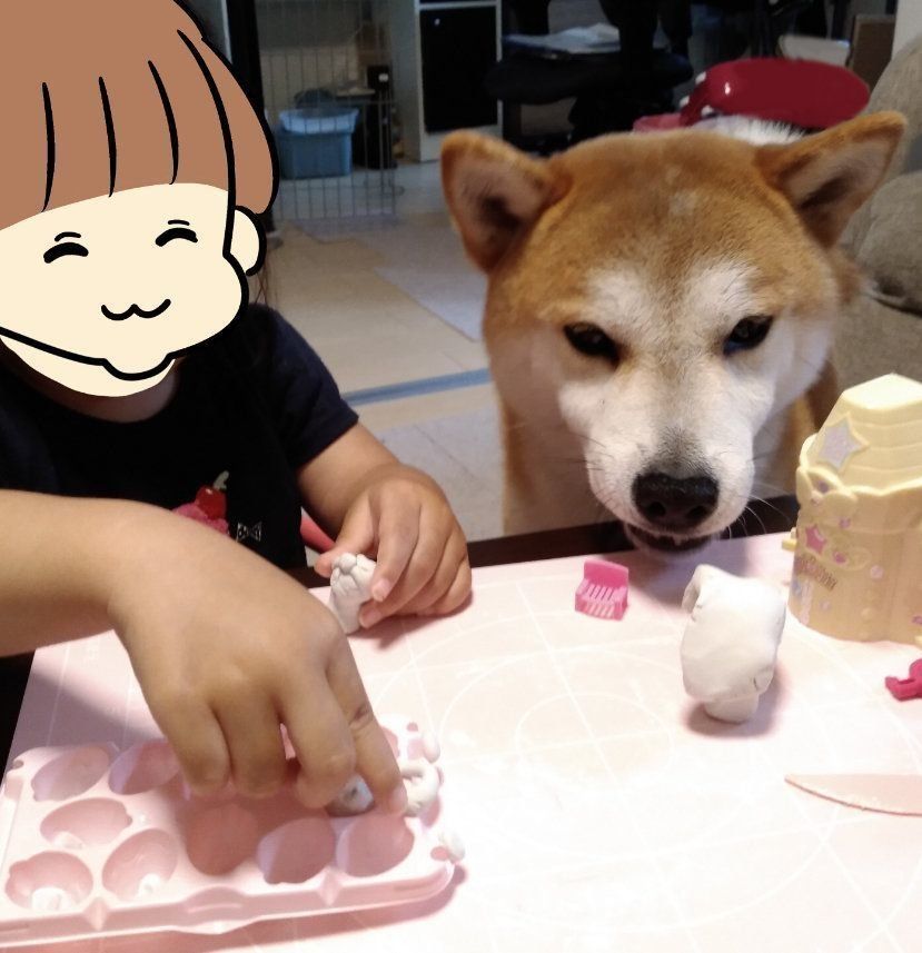 もちろん粘土で作った遊びのご飯です。タロさんは不思議そうに「これがご飯?」というような感じで粘土の匂いを嗅ぎます。