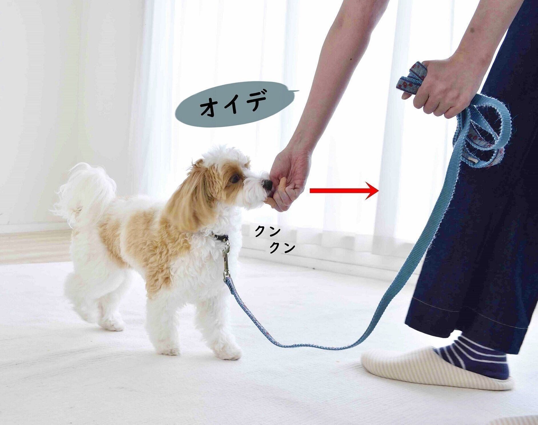なお、「オイデ」と指示したとき、こちらに来ずにほかの場所へ行ってしまう“浮気グセ”を防ぐため、次に紹介する練習法は、室内の練習であってもリードをつけて行いましょう。