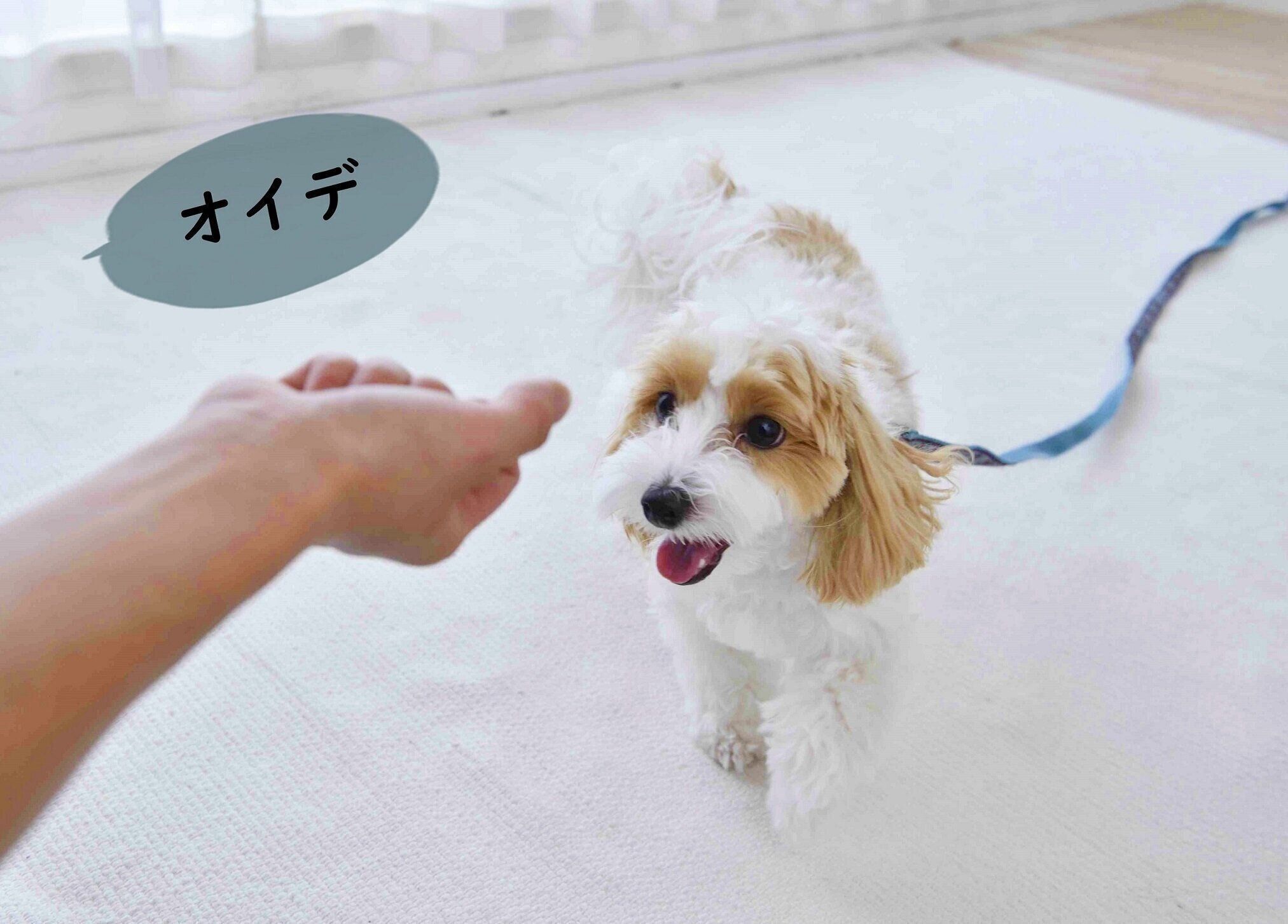ごうほうびのおやつやフードを握った手を愛犬にかがせたら、ニオイをかがせたまま「オイデ」と指示して後ろへ下がって。