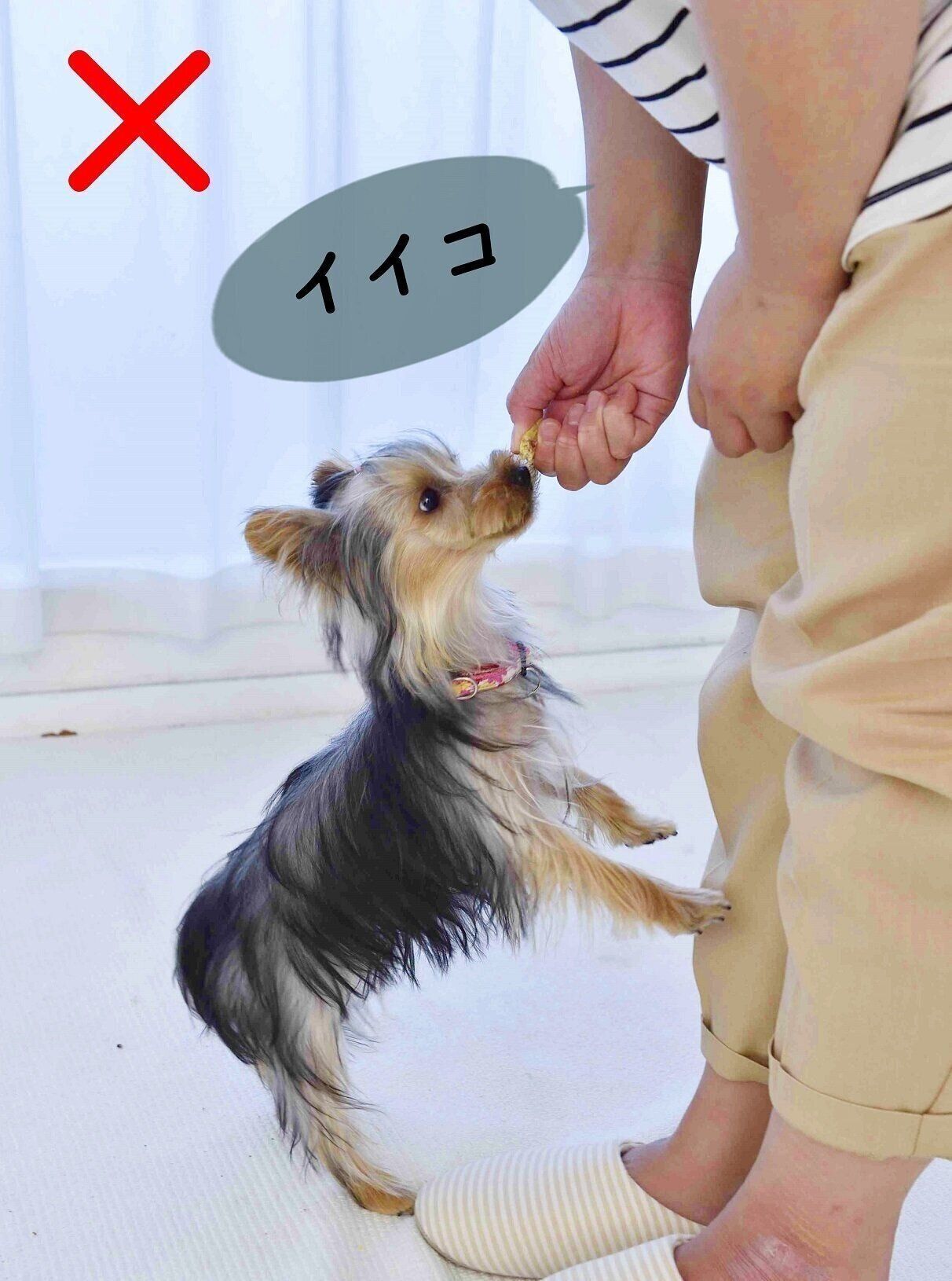 もし、おやつを握った手につられないのであれば、手のニオイをかがせて、おやつを握っていることに気づかせてからやってみても。