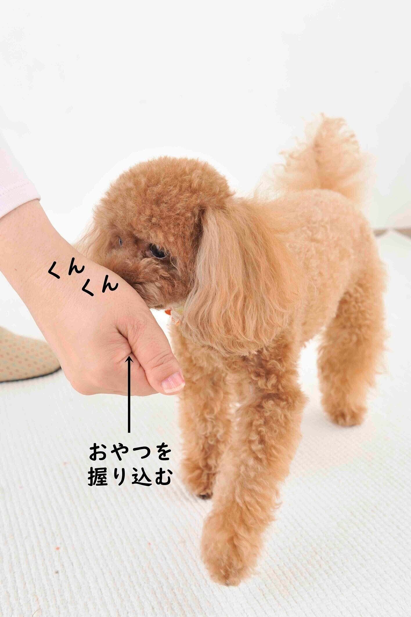 おやつのニオイが愛犬に伝わりやすいよう、握った手の指側を愛犬の鼻先に差し出し、ニオイをかがせます。