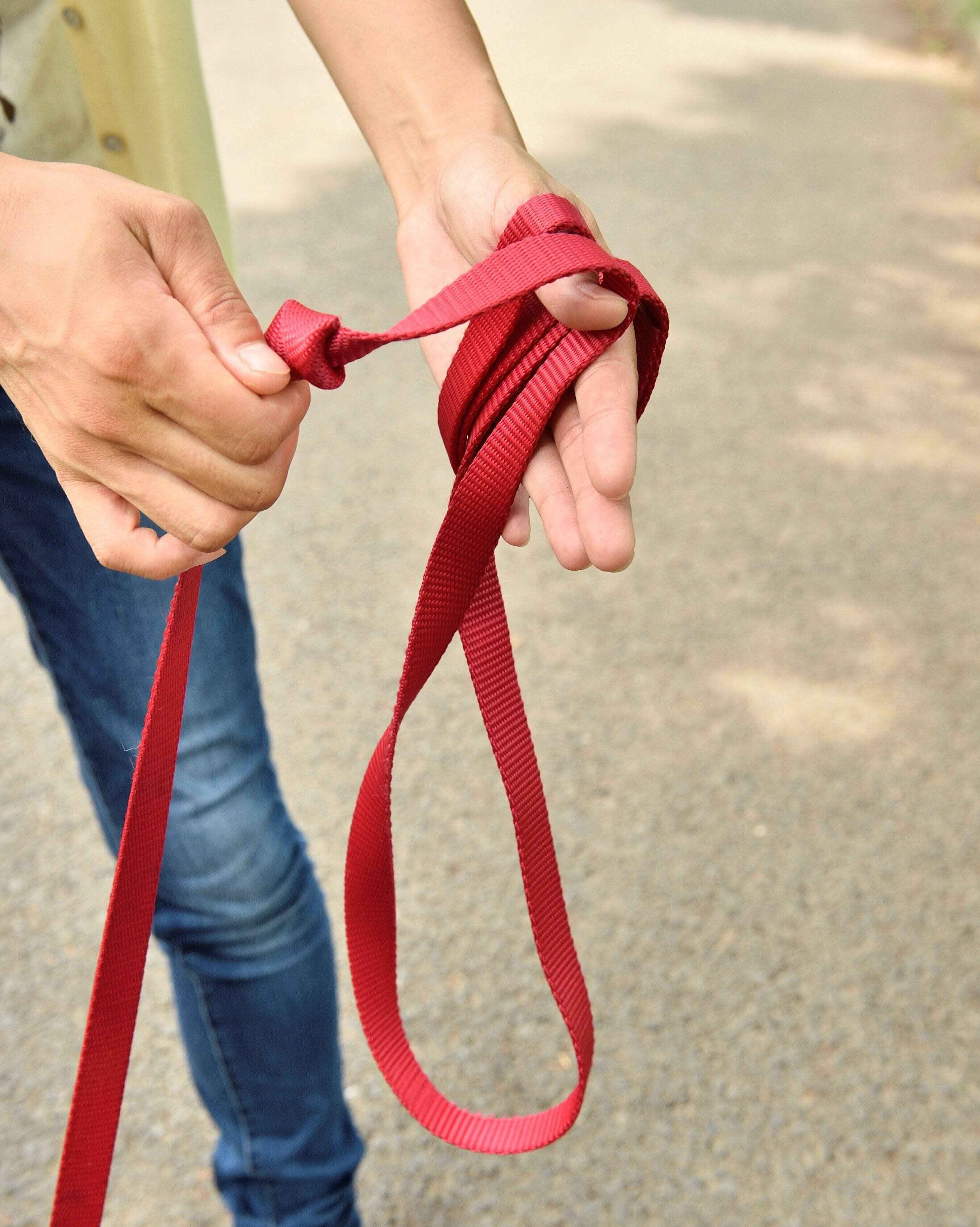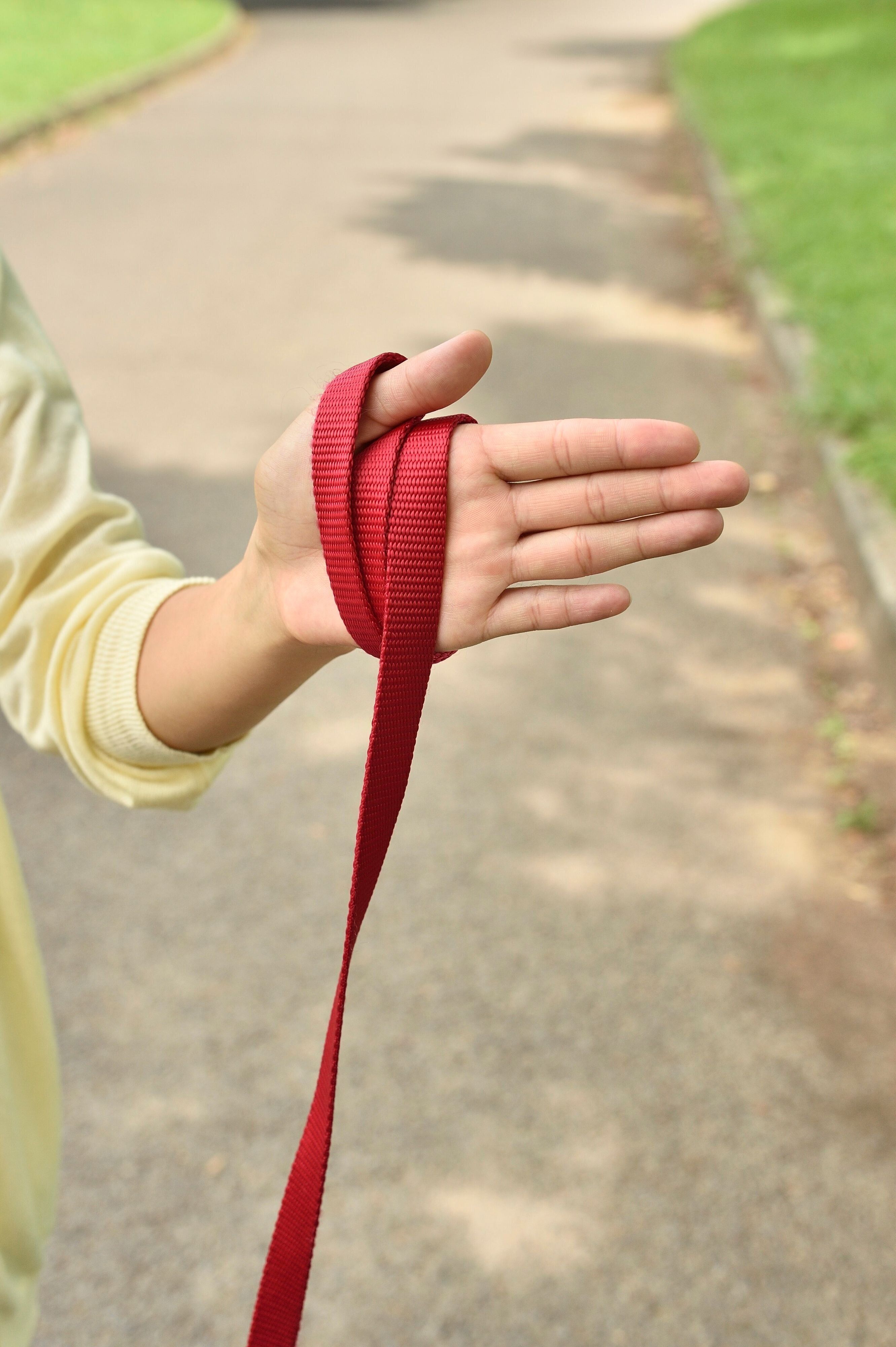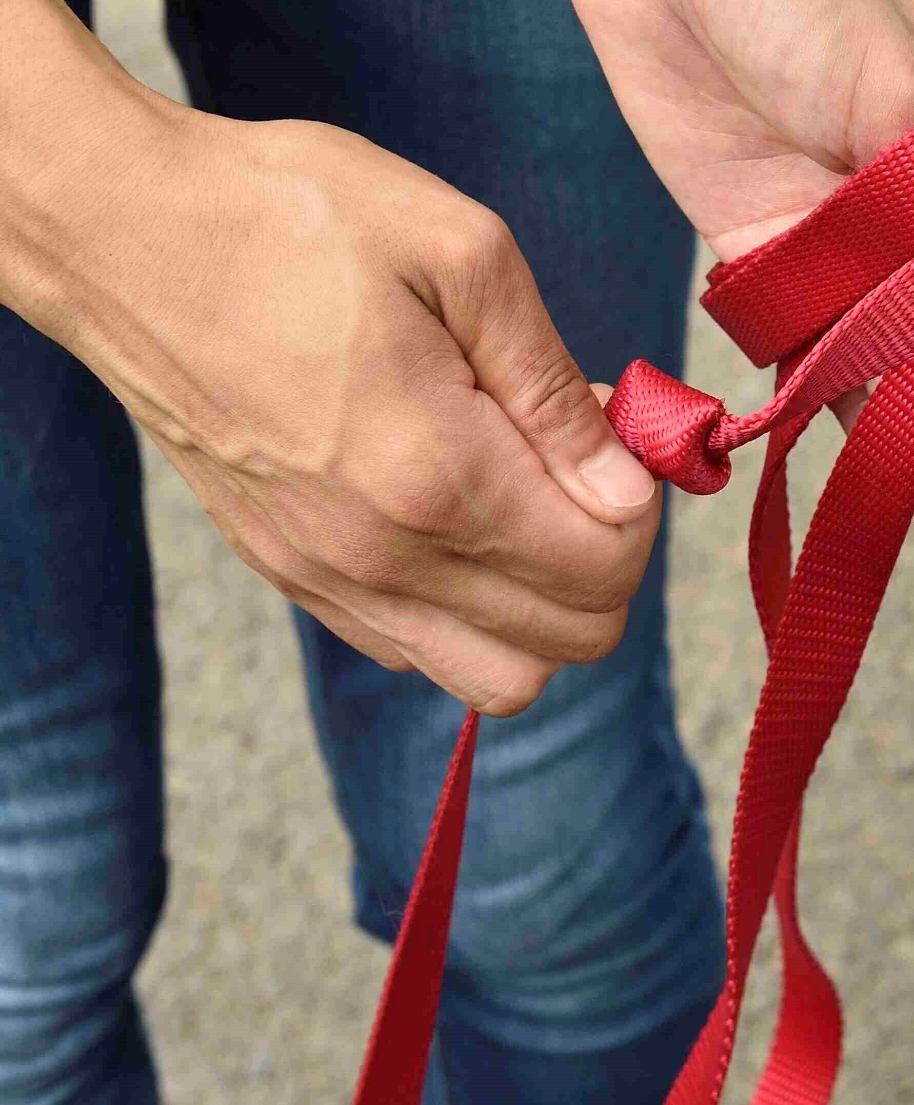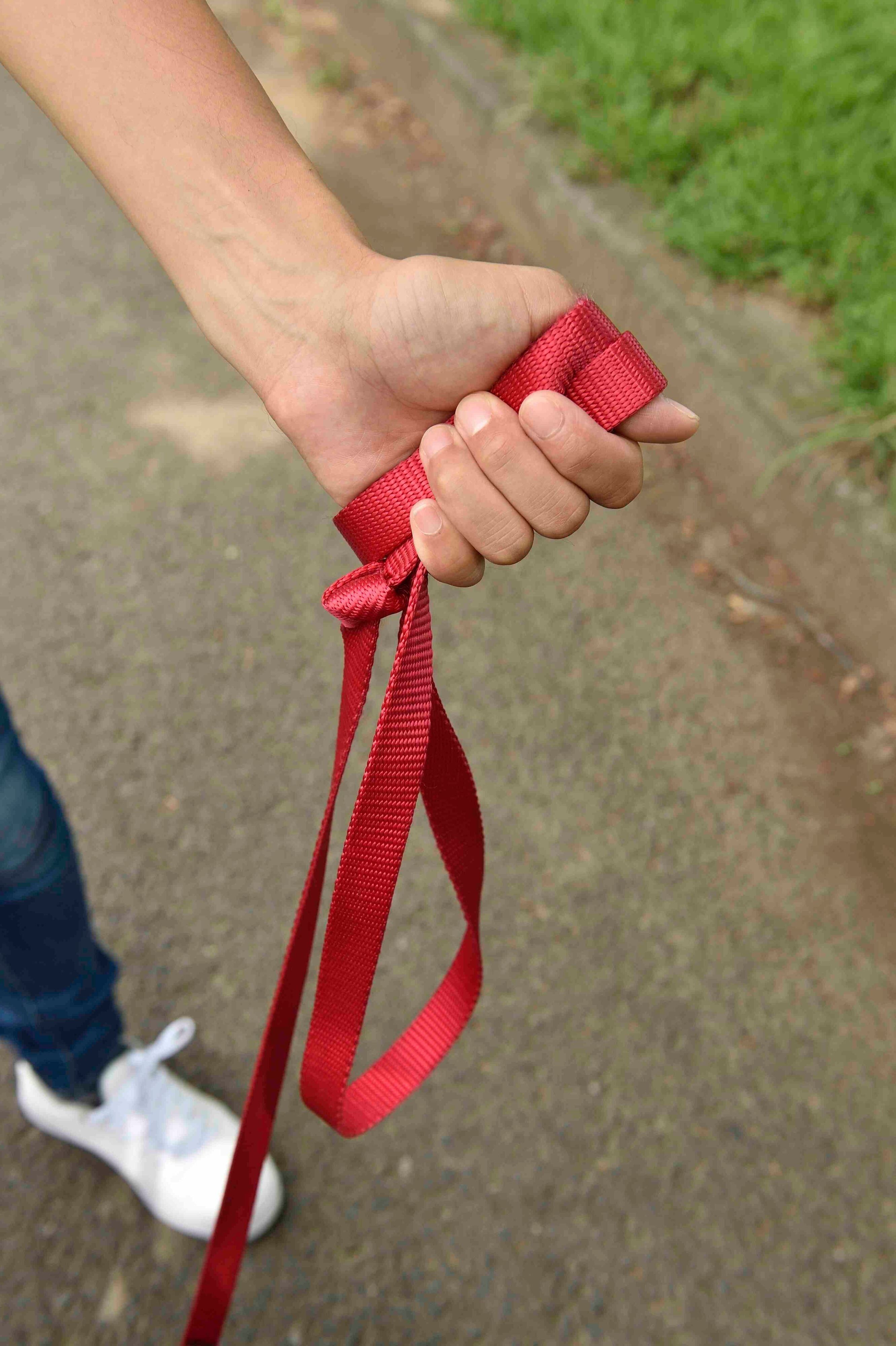 3.安全の目印をもって親指にリードをかける