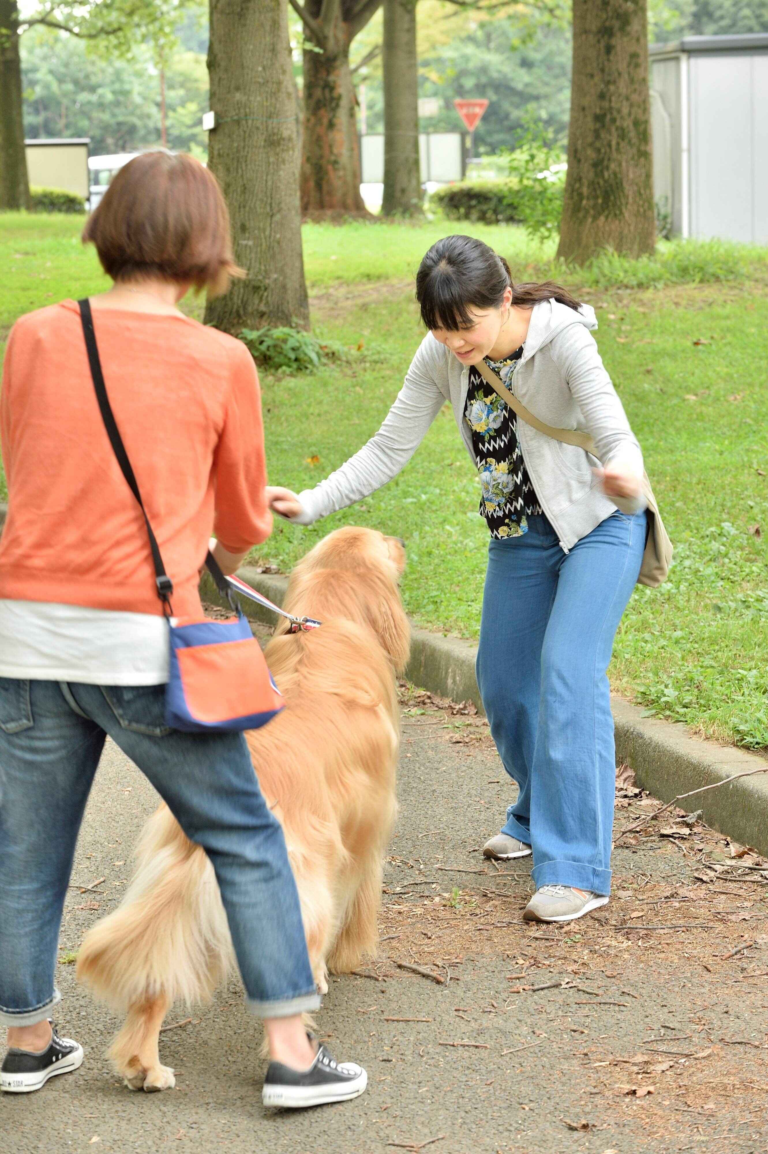 人に飛びついてしまうクセをそのままにしておくと、転倒させたりケガをさせたり、さらには興奮して噛んでしまうなどのトラブルが起こることもあるのでNG。リードを正しく持ち、興奮を落ち着かせる対応法で万全に対策するため、顔見知りの人や犬好きの人の協力のもと、下記を行ってみましょう。
