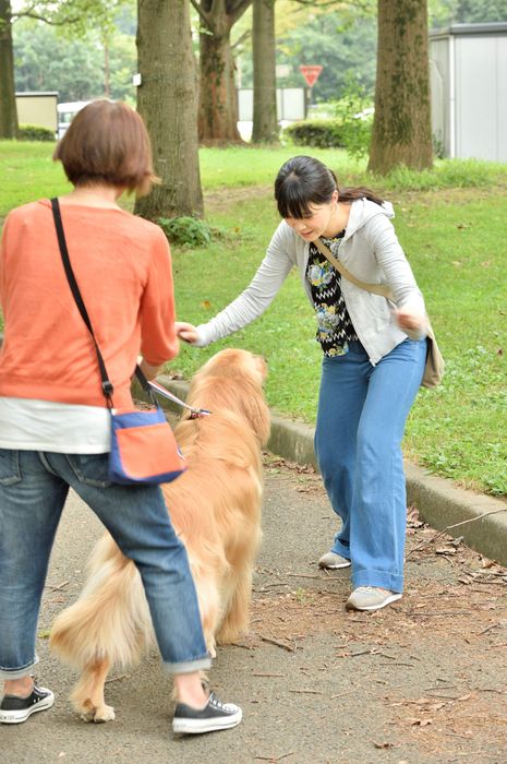 ※この解決ワザは、顔見知りの人や犬好きの人が相手だった場合に限り、協力してもらって行うものです。それ以外の相手の場合は、ほかの犬や人が近づいてきたら、リードを短めに持ってすぐにその場を離れるなどの対策を行ってください。