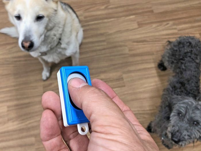 クリッカートレーニングの第一歩は、クリッカーを鳴らしてからフードを与えること。これを繰り返すことで、クリッカー音=「いいことが起きた」、と犬に伝わるようになる(フードは一次性強化子、クリッカー音は二次性強化子といいます。興味のある方は、学習の心理学のお勉強をぜひ)。