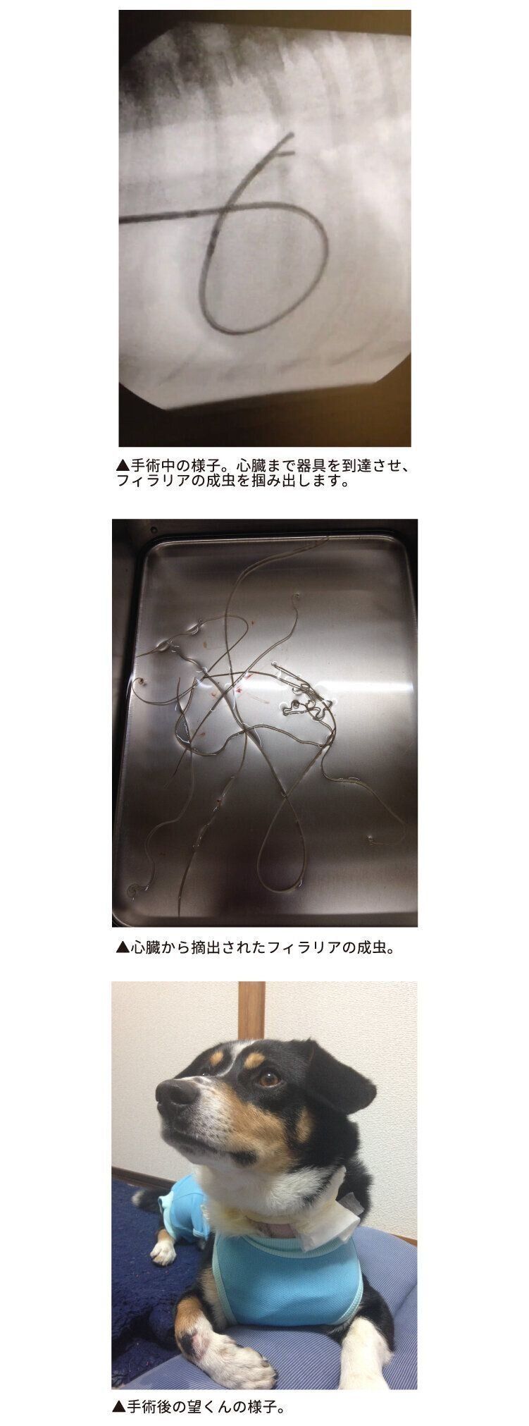 やがて手術は無事に終わりましたが、なんと14匹ものフィラリアの成虫が心臓から出てきたそうです。オスとメスが両方寄生していたため、血管内で子虫を産んで繁殖していたことがわかりました。その後、手術で取りきれなかった成虫がまだいたのでもう1年治療を続け、やっと検査で陰性が確認できました。ここまでに実質6年もかかってしまいました。」